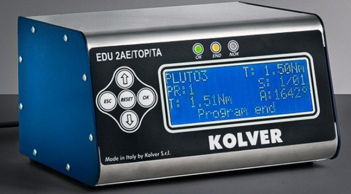 Řídicí jednotky Kolver EDU2AE/HPRO/TA a EDU2AE/TOP/TA ovládají šroubováky PLUTO a MITO s přesností ±5 % pro průmyslové montáže. EDU2AE/HPRO/TA má jeden program, sériový port pro tisk dat, počítadlo šroubů a 15 vstupů/11 výstupů pro PLC. EDU2AE/TOP/TA podporuje 8 P-setů, výběr programů přes čtečku čárových kódů nebo přepínací box a zahrnuje 8 Gb USB disk. Obě mají software EDU Expand, displej pro moment/úhel a funkce jako automatický reverz. HPRO/TA je ideální pro tisk a komunikaci, TOP/TA pro víceprogramovou flexibilitu.